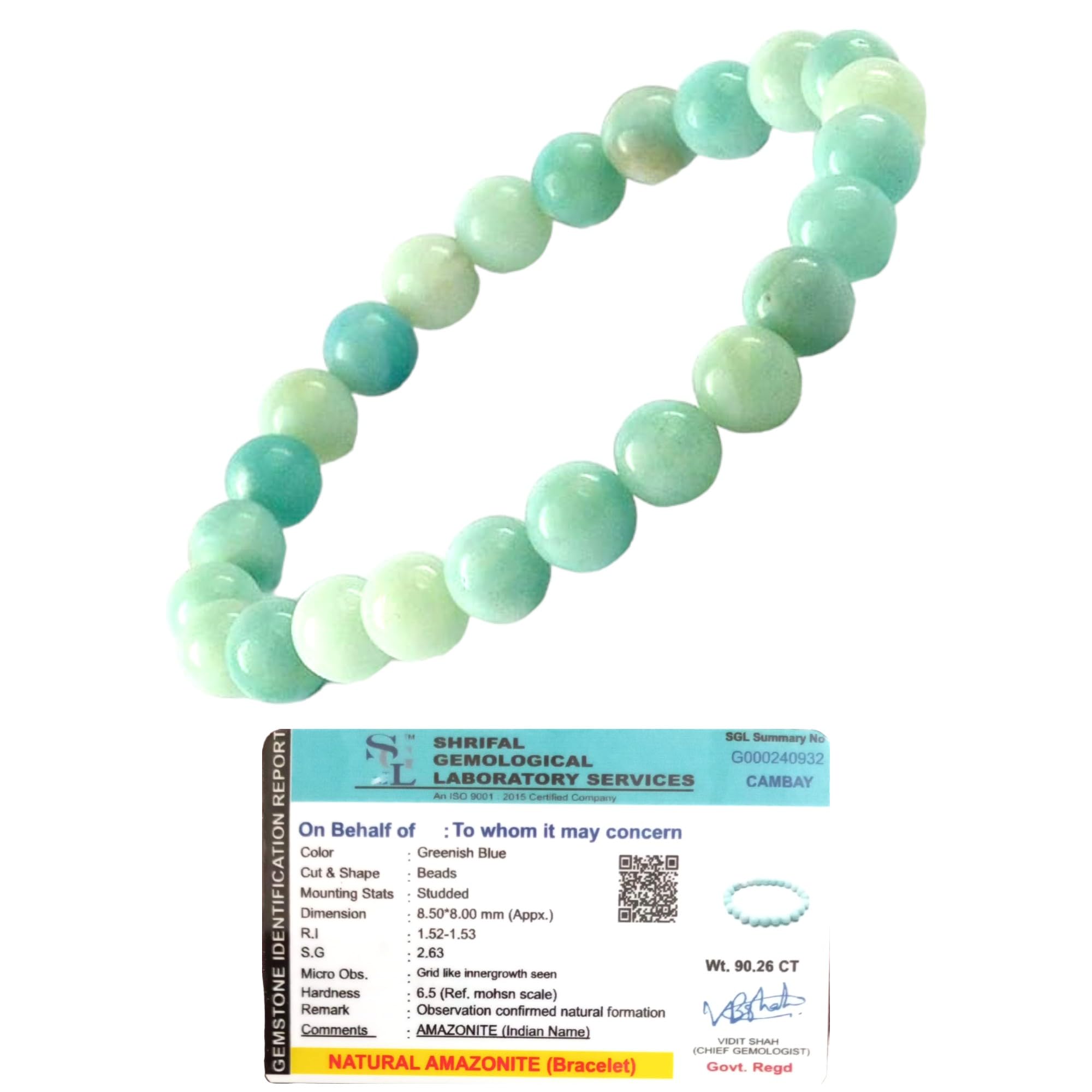 - This AAA grade lab-certified Amazonite bracelet enchants with its tranquil shades of aqua, reminiscent of serene tropical waters. Each meticulously crafted bead reveals natural variations, evoking a sense of harmony and balance, while exuding a soothing energy that calms the mind and rejuvenates the spirit.