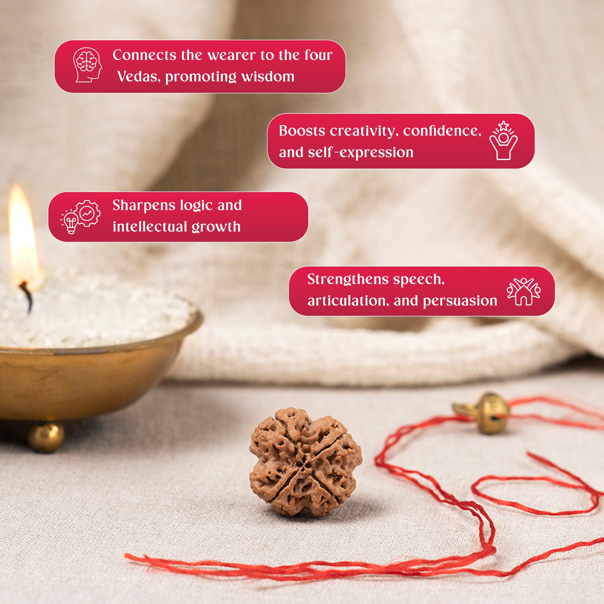 - Represents the Four Vedas: The 4 Mukhi Rudraksha symbolizes the four Vedas.