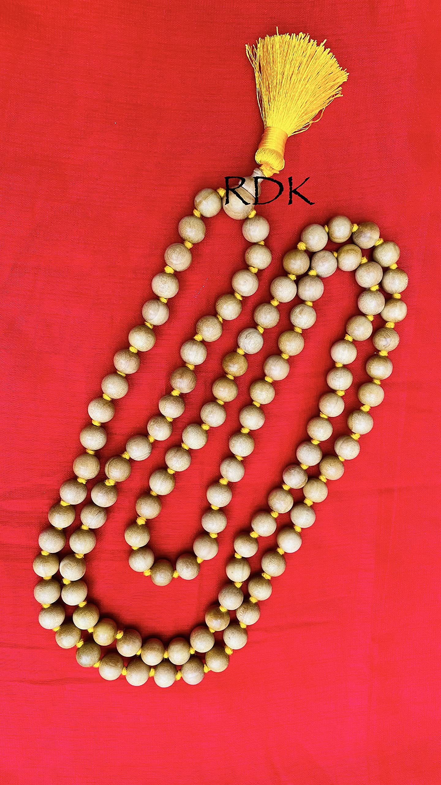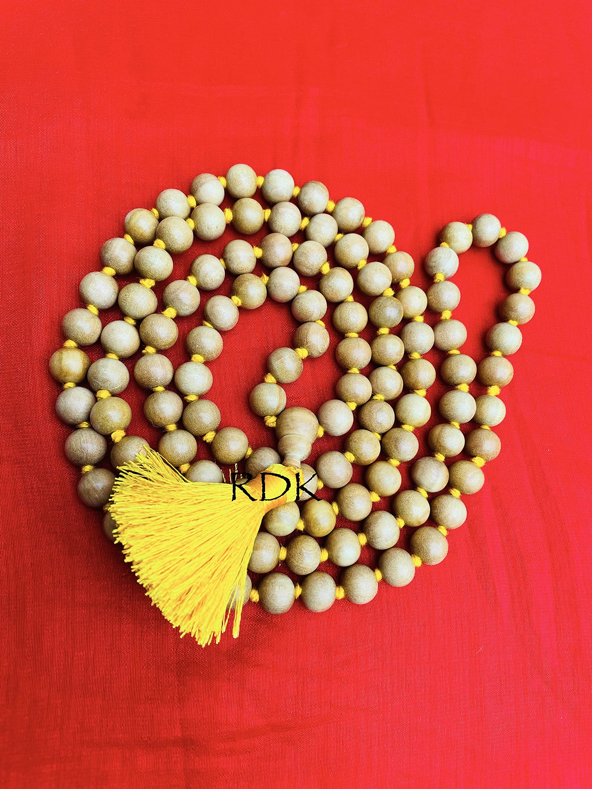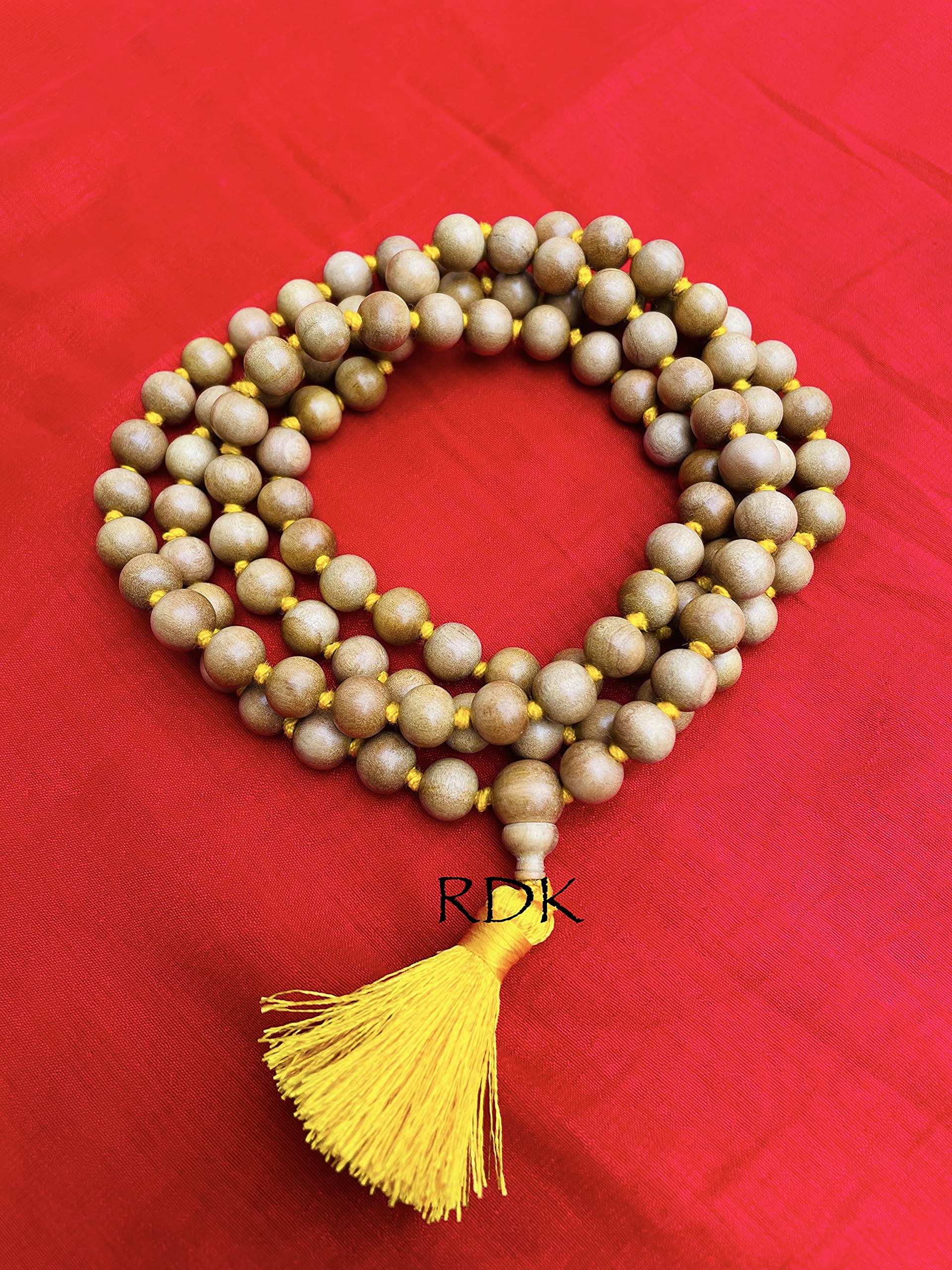 Mala is a simple string of beads used in japa meditation to count mantras, prayers, or intentions. Malas can also count breaths or used in a gratitude meditation. Mala is a Sanskrit word meaning garland. Malas is meditation beads or prayer beads and are ancient tools that were developed to keep the mind focused and clear from thoughts. Mala beads are also referred to as mantra beads, meditation beads, Hindu rosaries, or Buddhist prayer beads. This mala is made from natural and original sandalwood beads. This Mala has 108 beads. The beads are made from original sandalwood. It can be used as a jaap mala. This Mala also helps attain your aim and ambitions. This Mala helps to control anger, stress and irritation. This mala is good for welcoming and for giving you honor. Wearing this mala has a cooling effect on the mind and body. This mala is made of sandal beads of uniform size in the brown thread with knots. This Mala also used to wear in hands as well.